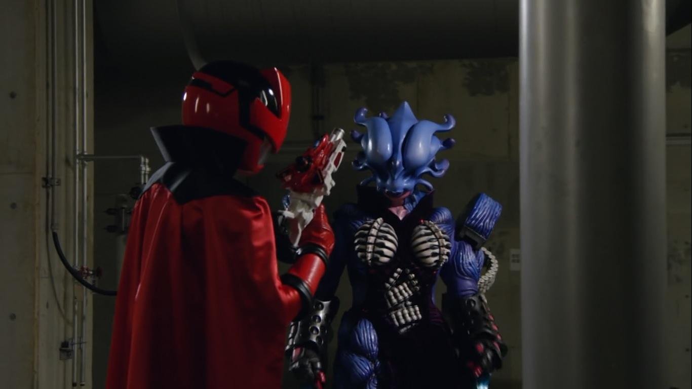 Tsukasa bursts back into Juror, demanding to see Kairi. To her surprise Kairi appears at the door to the back room. Jim Carter sneaks away from the distracted Lupinrangers and coincidentally heads down the same dead end that the Porderman previously used. He leans against the wall only to fall through a hidden door. The Patrangers have left the bistro and “Kairi” removes his disguise to reveal that he’s really Kogure. At the plant “Lupin Blue” and “Lupin Yellow” reveal they are clones of the real Kairi made using the Good Striker’s power that then disguised themselves as their two colleagues.