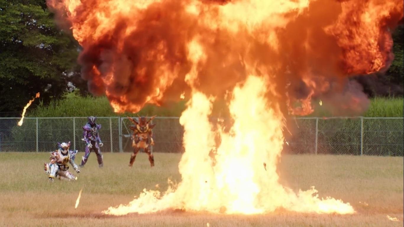 The battle is hard on the Riders initially as Evolt is stronger than ever, but the teamwork of the Riders gives them the edge. While Kazumi and Gentoku use their finishers to keep him in place, Ryuga uses his new Blizzard Knuckle to hit the Evol Trigger, preventing Evolt from dodging Sento’s Rider Kick and destroying him. As the other Riders celebrate Sento retrieves three Lost bottles from the scorched remains of Evolt, only for his father to appear and steal them out of his hand.