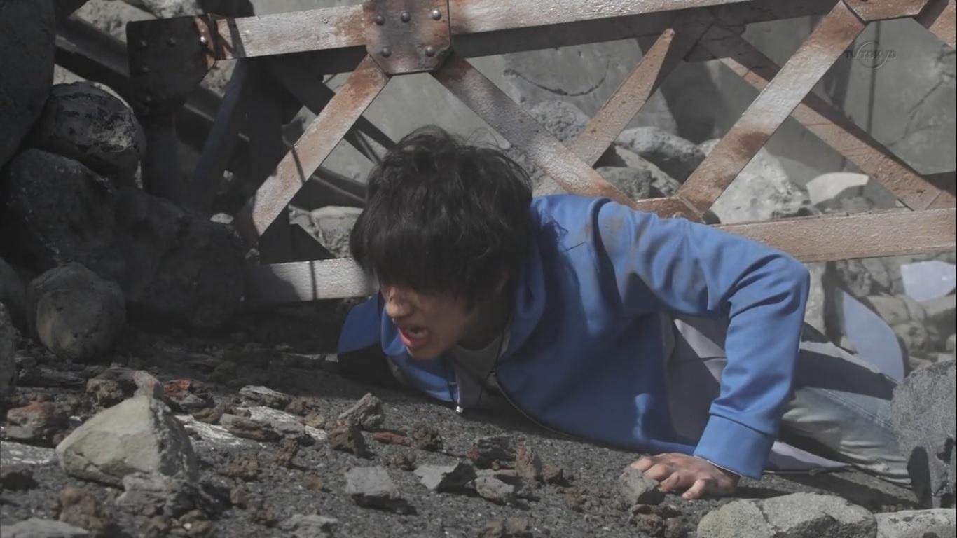 Black King destroys the building closest to Isami, trapping him under some rubble. With his R/B Gyro out of reach, he is helpless as his sister attempts to free him. Katsumi approaches the scene and unveils his Gyro in order to transform, only for it to show him a vision of Isami’s current point of view, informing him of his siblings’ situation. Black King unleashes another blast which knocks Asahi unconscious. Katsumi catches her as she falls and manages to free his brother from the rubble. The duo take their sister to their father who takes her to safety.
