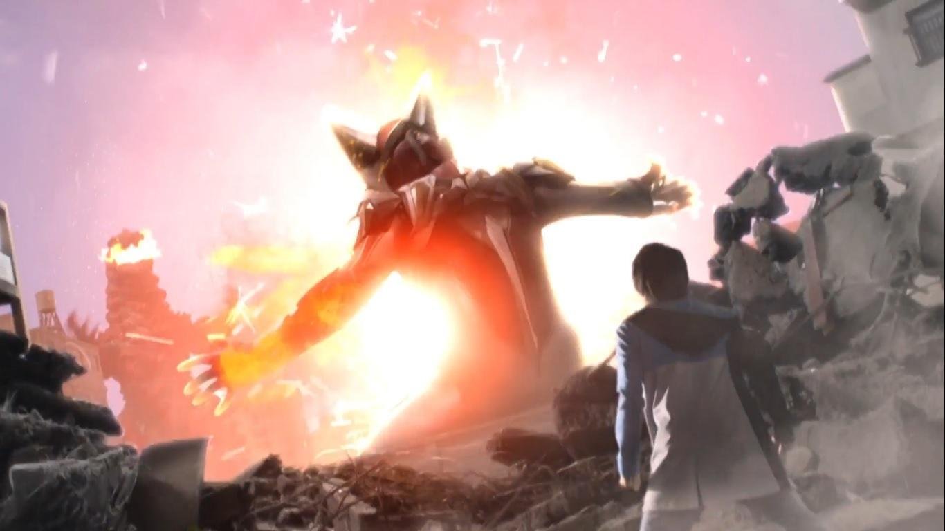 Aizen holds up his AZ Gyro and inserts the Orb crystal. It summons the Orb Ring Neo, which Aizen then uses to become Ultraman Orb Dark (Noir Black Schwartz). He uses his Orb Dark Calibur to blast rocks at the brothers. He then recounts some of their previous adventures in which he believes the brothers failed to act as “true” Ultramen. Realising that it was Aizen’s fault that Koma was injured, the brothers transform and attack Aizen. He easily avoids or blocks their attacks while continuing to berate them and easily manhandling them. He delivers attack after attack on the brothers, eventually forcing them back to human form and stands laughing over their unconscious bodies.