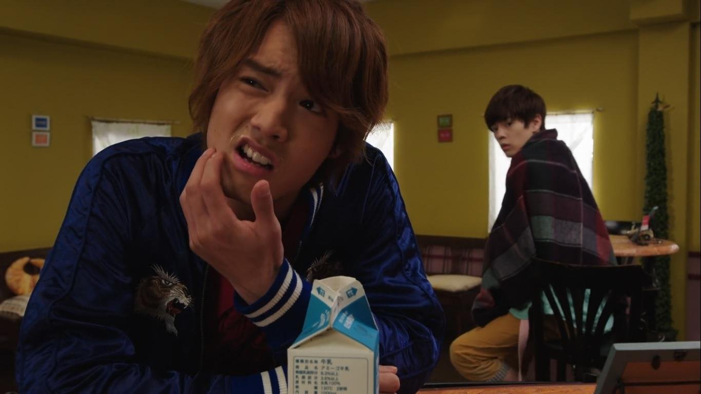 While they order a snack, Tsukuyomi explains that following the battle with Oma Zi-O she and an acquaintance named Geiz travelled back from 2068 to prevent Souma from attaining power. She warns him that the Ride Watch he stumbled upon earlier has the power to turn him into the evil dictator and destroy the world. When two men get into a scuffle nearby, Tsukuyomi decides to test Sougo’s aggressiveness by getting him involved. The men throw him into a river but he responds positively to his dunking.