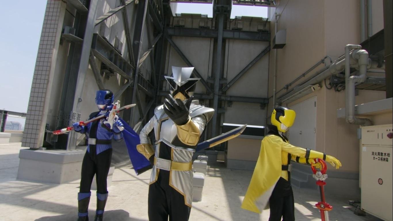 Sakuya (Patren #2) and Tsukasa (Patren #3) have tracked down the Gangler, Kankus, which seems to be doing nothing more than waving it’s fingers around and giggling. They attack and it somehow causes an explosion right by where they are standing, though they are protected by transforming. Keiichiro meets the person who texted him, a gangster who had agreed to sell him a firetruck-like VS Vehicle that had come into his possession.