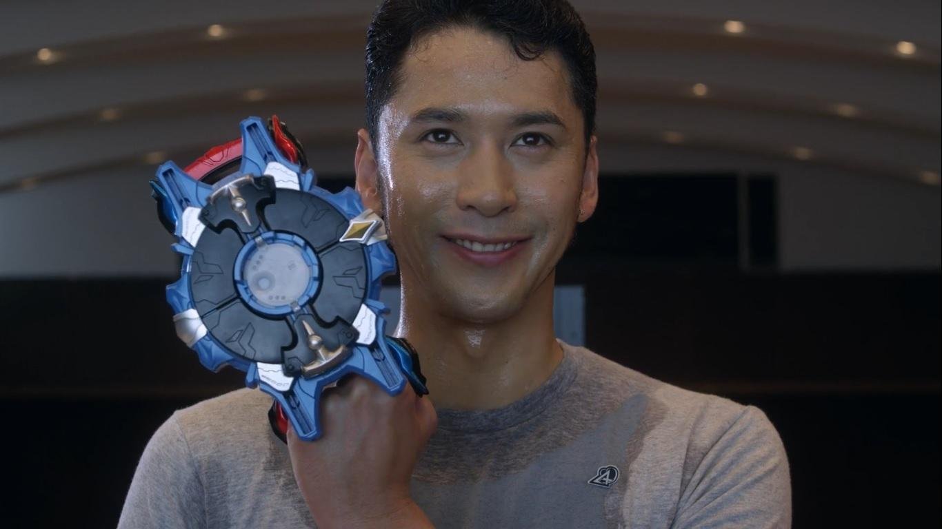 Back at the store Isami is looking up their new crystal in their mother’s notes. The TV is showing another report on Ultraman Orb, who this time catches a red balloon (similar to Pigmon’s) for a little girl – the same girl from earlier! She tells the reporter his drawn-out name, still unable to properly pronounce “Schwartz”. The brothers realise that Aizen is manufacturing incidents to allow him to save the day. They transform and call out Aizen, who was similarly training in his personal gym.