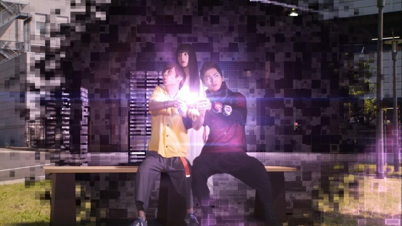 Sougo has spent the entire morning being freaked out by Geiz and Tsukuyomi looming over him, nor the way they can blend in despite their school uniforms retaining elements of their usual outlandish clothing. After utilizing a simple distraction he hides in a sports equipment storage room to try and eat his lunch in peace, but comes across fellow student Tokiwa, who has skipped classes all morning to try and defeat a supposedly unbeatable video game which appears similar to the classic platformer ‘Mighty Action X’.