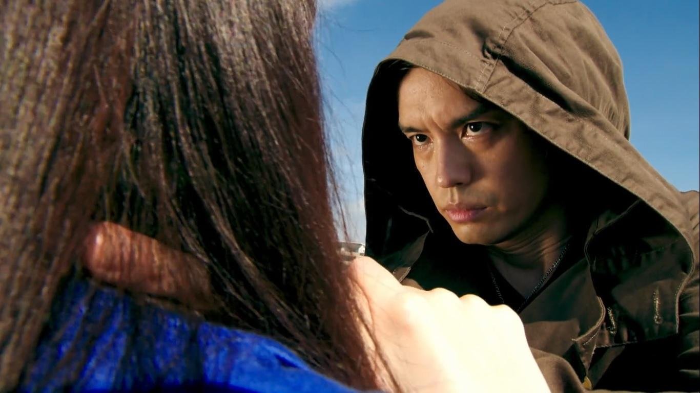 Karin is up on an open rooftop. There is a fence on the edge tall enough to prevent anyone accidentally falling off. She is attacked by the man in the hoodie – Masato Kusaka a.k.a. Kamen Rider Kaixa. Sougo and the others see her fall from the roof and rush towards her. When they arrive they find she is unharmed and crouched beside Another Fourze. Sougo and Geiz transform and rush into battle.