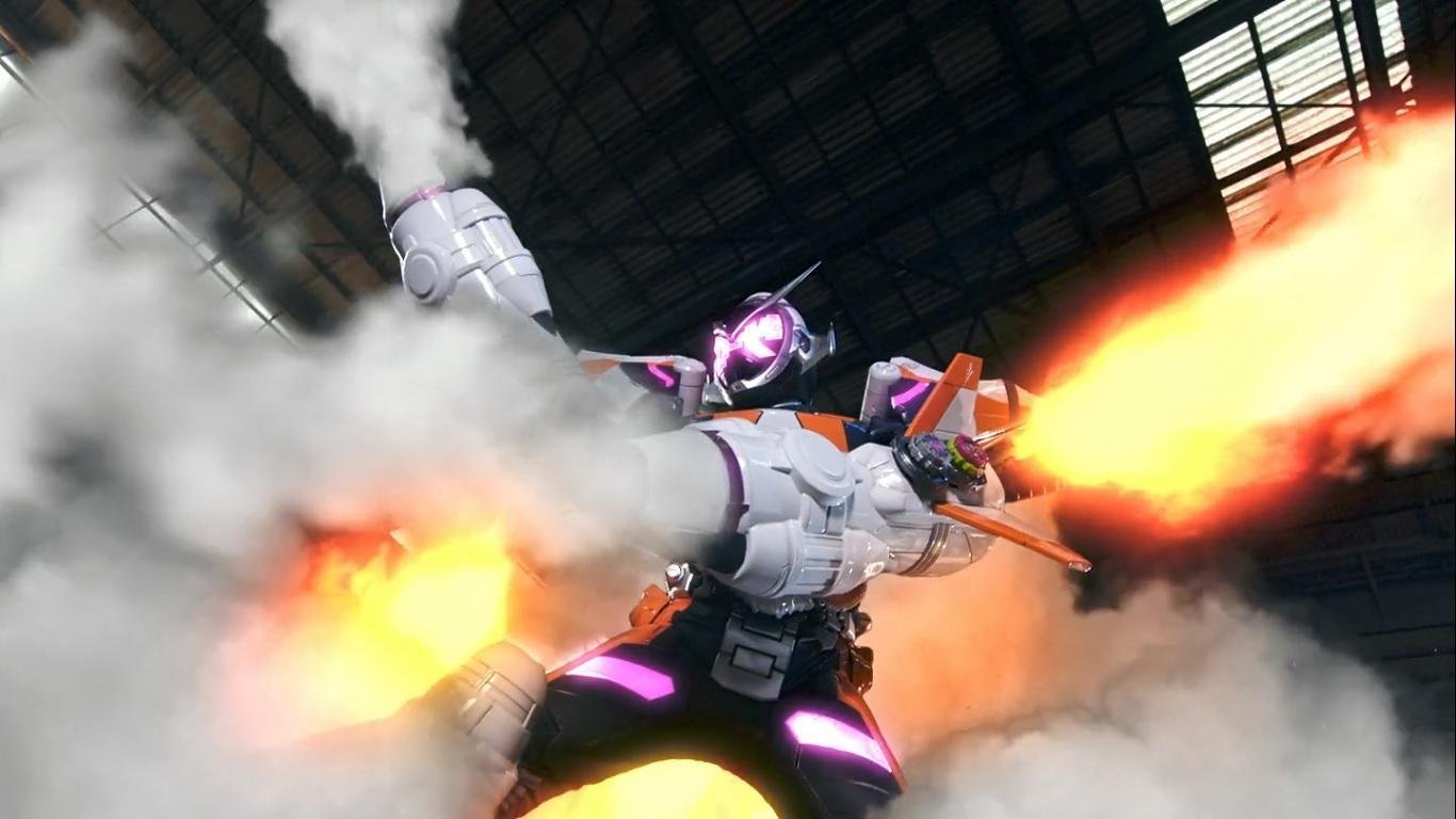 The battle is being watched by Daita “Kong” Kondou and Chikao “Rat” Nezu, two former members of the ‘Monster League’ who appeared in Kamen Rider × Kamen Rider Wizard & Fourze: Movie War Ultimatum. During the fight Sougo drops his Build Ride Watch, which Geiz then uses. He performs the Build finisher on Another Fourze (correctly, with the floating equations back as they should be) which merely forces him back. Karin then interferes, pushing Another Fourze as if trying to get him to run away.