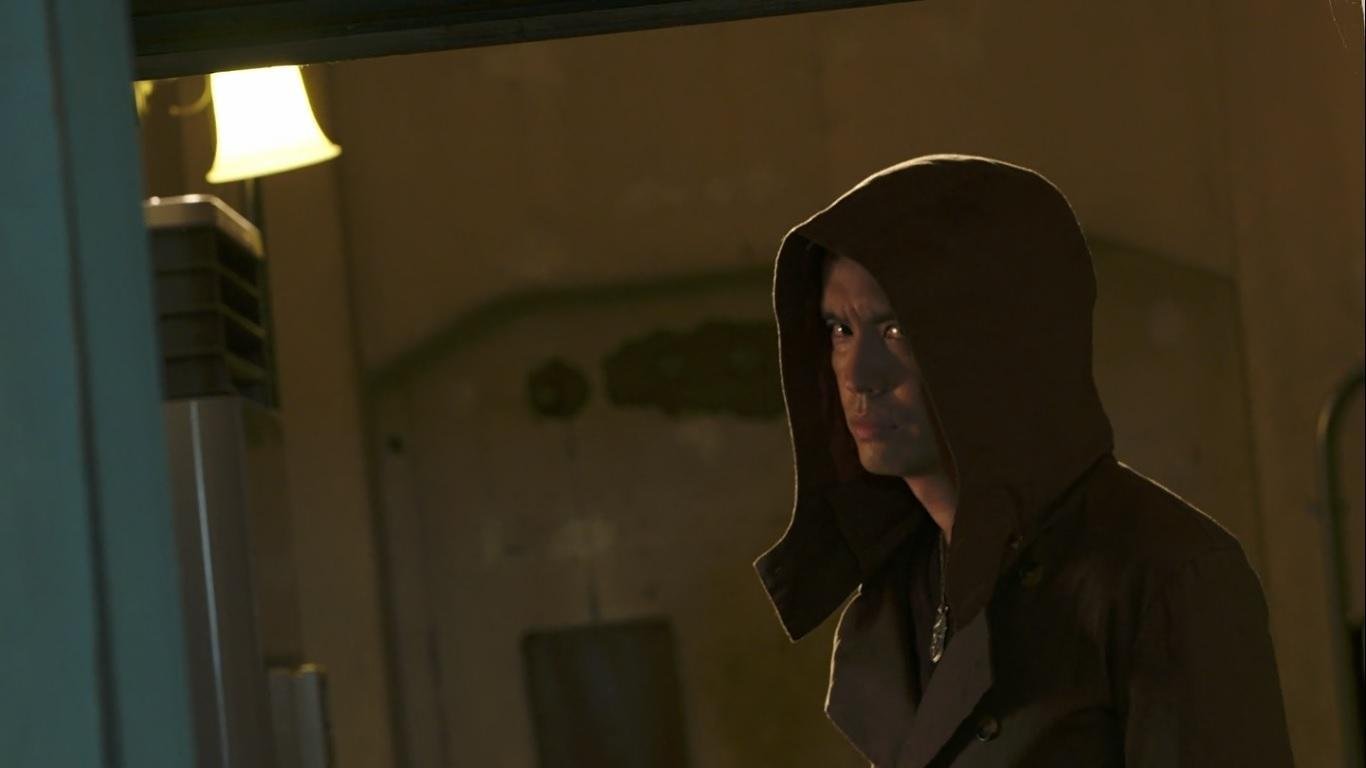 The three change into this school’s uniforms – with Tsukuyomi and Geiz customising theirs as before – and attempt to search the school for a potential victim. Getting nowhere, Geiz believes he will have to hack the school’s computer system to access their student data. Sougo devises a more simple plan: He throws himself against a wall and crashes down a staircase before sending the others to fetch the school nurse to check his injuries. Meanwhile a man in a hoodie lurks outside the school gates.